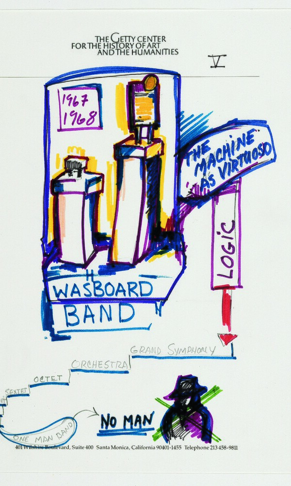 Von Huene, der als engagierter Lehrer an verschiedenen Kunstakademien tätig war, schuf für die Vorbereitung oder im Kontext seiner Lehre zahlreiche Skizzen und Studien. In den 1980er Jahren entwickelte er eine besonders charakteristische Form der Zeichnung nordamerikanischer Provenienz weiter: die Mind Map, eine Art ‚Gedanken-Bild’. In diesen Schaltplänen der Erinnerung und des konzeptuellen Entwerfens wird von Huenes gedanklicher Kosmos ebenso sichtbar wie seine Entwurfsstrategien. In den Mind Maps des Getty Talk werden in chronologischer Abfolge seine Klangskulpturen mit den wissenschaftlichen Kontexten ihrer Entstehung vernetzt.